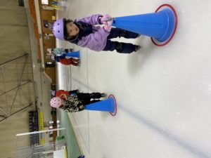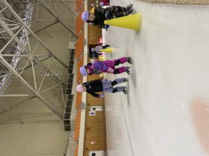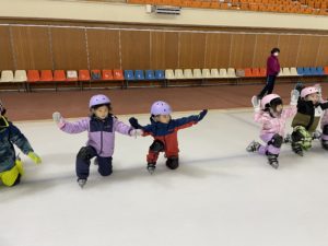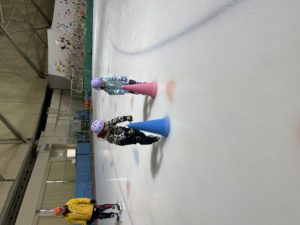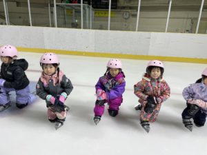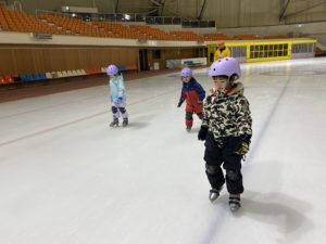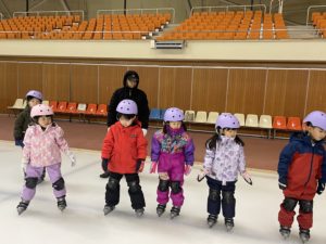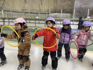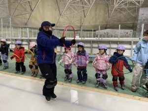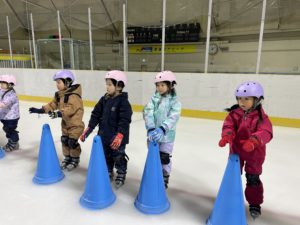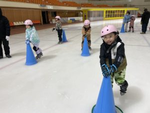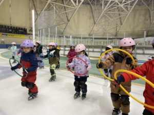 盛運輸アリーナで行った年長組さんのスケート教室。3回目には、三角コーンを使わずにリンクを滑れるほど上手になりました。