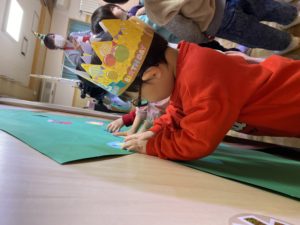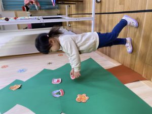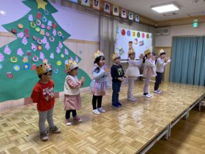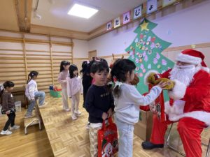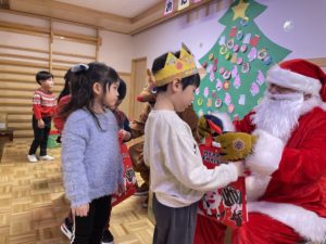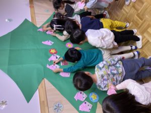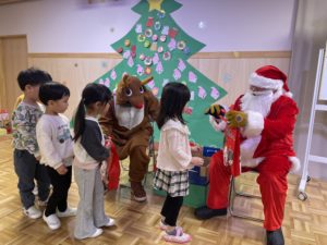 12月生まれのお友達のお誕生会とクリスマス会を行いました。お友達にお祝いしてもらった後は、楽しみにしていたクリスマス会。大きなツリーにオーナメントを飾ったり、サンタさんとトナカイからプレゼントをもらいました。