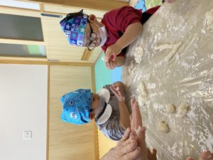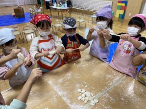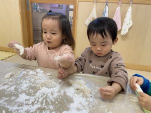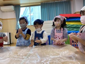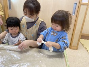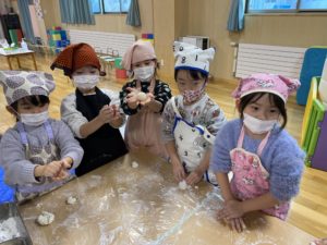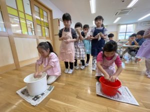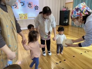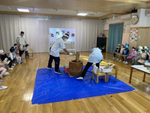 もちつき会を行いました。おもちができるまでの話を聞いたり、杵を使って力強くもちをついたり、ついたもちを丸めて感触やにおいを楽しみました。