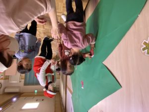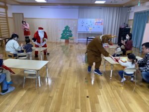 12月のスマイルKOUDA。サンタのお面作りやクリスマスツリーの飾りつけをしました。サンタクロースとトナカイも遊びに来てくれてプレゼントをもらいました。