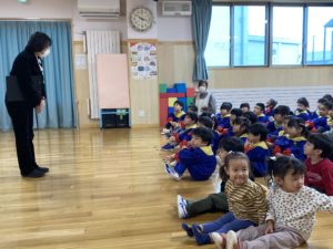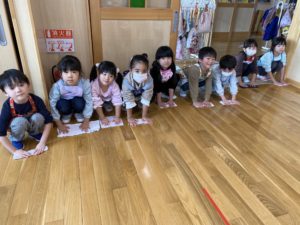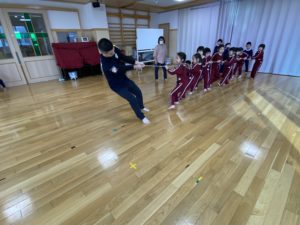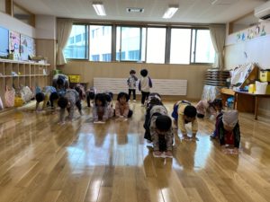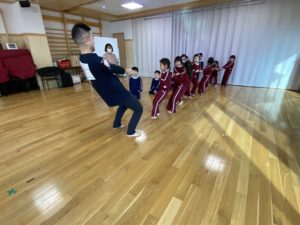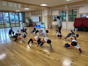 毎週水曜日に行っている川戸元貴先生の体操教室。月末は年長、年中組さんと、年少組も参加しています。