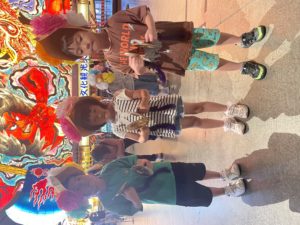 午後はラッセランドへ。青森山田学園の小屋で、大型ねぶたの見学をしました。その後は手作りの花笠とうちわを持ってワラッセに行って、跳人、囃子体験を楽しみました。
