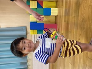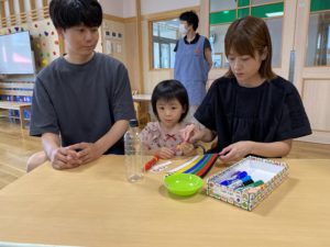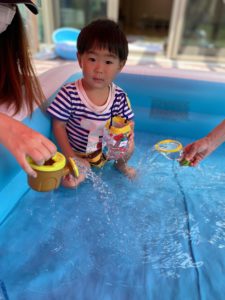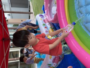 8月のスマイルKOUDAは、水遊びを楽しみました。ペットボトルにシールを貼ったり、マジックでお絵描きをしてペットボトルシャワーを作って水遊びを楽しみました。。