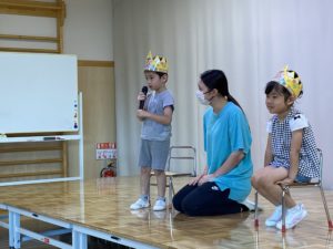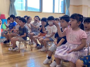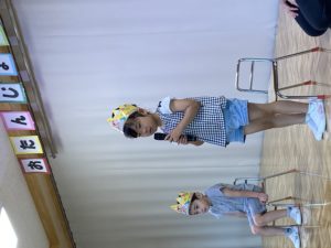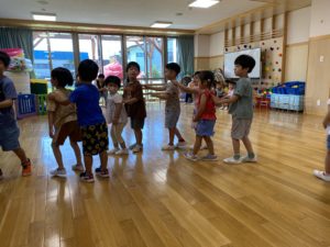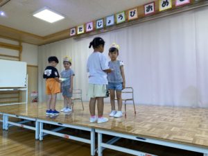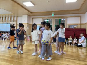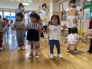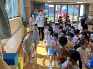 8月生まれのお誕生会。元気いっぱい、にこにこ笑顔で入場したお誕生児の子ども達。ダンスをしたり、ふれあい遊びを楽しみました。