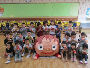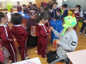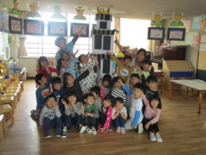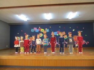 11月生まれのお誕生会をしました。質問タイムは「好きな食べ物」。「かき」「いちご」「海老フライ」。好きな食べ物をいただいている時のみんなのおいしそうなお顔が浮かんできます。お楽しみは12月7日のお遊戯会のために練習しているお遊戯をすこーしだけみんなの前で披露しました。こんなもんじゃあありません。当日本番をご期待ください。胸が高鳴るお遊戯会はもうすぐです。