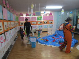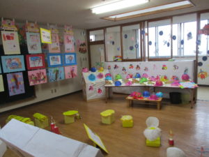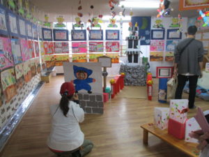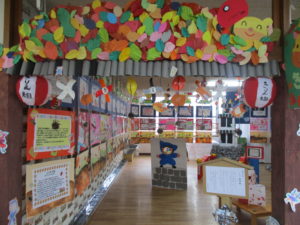 最大級の台風19号が上陸するとのニュースがそれこそ嵐のように押し寄せてきて開催が危ぶまれましたが、前ぶれの大雨模様のなかで、なんとか開くことができました。おまけに寒い風も吹いていました。きりん組さんは「風雲麒麟城」こあら組さんは「デザイン あ」うさぎ組さんとりす組さんは「ポニョ」のテーマでそれぞれのお教室をかわいい作品で飾りました。ご招待のスマイルさんには悪天候でしたので強くお誘いしませんでした。せめて当日の様子をここでご覧ください。ハロウインの飾りつけは10月いっぱいやっています。園を知りたい見学は随時受け付けます。お電話くださいね。