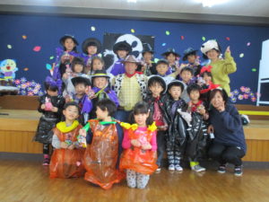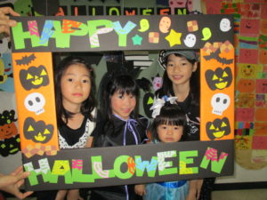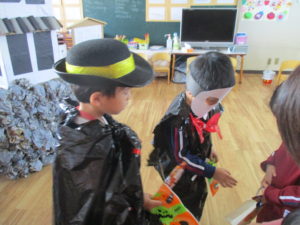 10月といえばハロウインですね。一足早く甲田幼稚園ではハロウインを楽しんでいます。作品展とバザーの飾りつけからみんなの変身衣装。英語のオリビエ先生は毎年あっと驚く仮装でレッスンを盛り上げてくれます。今年はトイストーリーのウッディでした。そして今日は園内のクラスを回るハッピーハロウインデイ。袋にたくさんのお菓子をいただいてうれしそうな子どもたちでした。