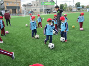 今年度最後の姉妹園合同のサッカー教室がありました。だいぶ寒くなりました。昨夜の雨で芝生も濡れていないかしら。なあんて心配ご無用。グラウンド狭しと走りに走りました。キックの足さばきもなんとなくそれらしく...。終わってからみんなで記念写真を撮りました。黒田監督やコーチの皆さまには今年も大変お世話になりました。この頃、FIFA ワールドカップアジア予選の試合を見ていると、何回も「柴崎、柴崎ッ」てアナウンスされていますよね。抜群のパス回しが光る日本代表の柴崎岳選手はご存知、青森山田高校の出身です。その同じグラウンドでサッカー教室ができる子どもたち、うれしいね。ありがとうございます。柴崎選手、日本代表、これからも頑張ってください。