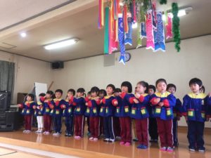 暦では明日から10連休です。その間に平成から令和へと年号が変わりますね。なんとなく気ぜわしい今日ですが4月生まれのお誕生会と5月の節句を前に子どもの日のつどいがありました。今年からお誕生会はお誕生児の保護者の方も一緒です。お母さんと手をつないで、いつもと違う入場に子どもたちの笑顔も格別に輝いていました。子どもの日のつどいはみんなが製作したマイこいのぼりを披露しました。芳子先生のパタパタシアターや純子先生の柏餅リレーを思う存分に楽しみました。令和の最初の子どもの日をみんなはどうやって過ごしますか?どうかみんな元気に大きくなあれッ。