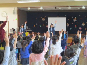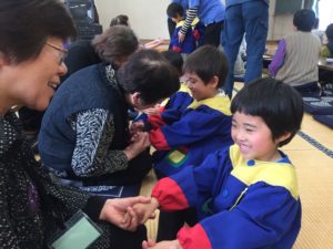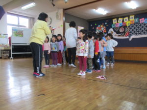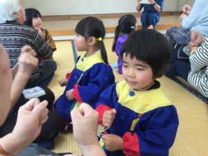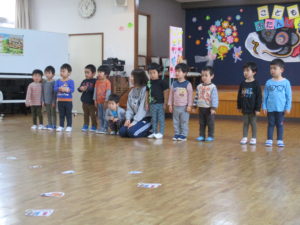 年中さんが近くの会館の敬老お昼の会にお招きを受けて出かけてきました。お出かけ前にもリハーサルを決めてさあ本番です。どんぐり山などの手遊びをしてからステージへ。元気いっぱいの歌とおゆうぎでたくさんの拍手をいただきました。