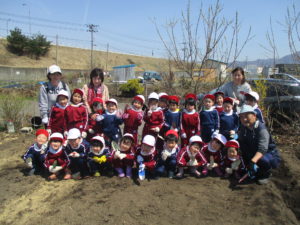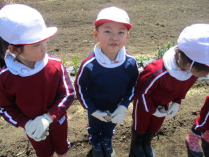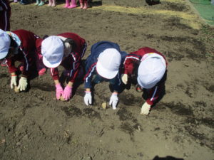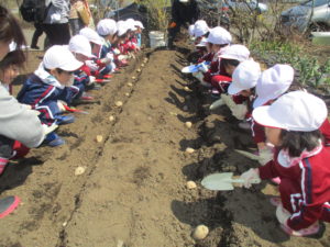 文字どおり雲一つない晴天の下、年長さんが恒例のじゃがいも植えに行ってきました。幸畑にある“甲田幼稚園の畑”で学園評議員の新田先生から植え方を教わり、一人一個ずつ植えて土をかける作業をしました。