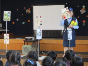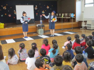 青森市の係の方が来園して交通安全教室を開きました。「横断歩道では必ず止まります」をみんなで唱和してしっかりと道路の渡り方をお勉強しました。今日習ったことを忘れないで、ご家族みんなで交通事故に気をつけましょうね。