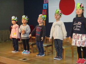 暦が変わって2月の初日、未就園児さんをご招待して豆まき会をしました。みんなが作った鬼のお面で颯爽と集合。先生たちが熱演する鬼退治の寸劇を観た後で鬼のお面披露。未就園児さんたちも作りましたよ。「おこりんぼオニさん」「泣き虫オニさん」「いじわるオニさん」みいんな飛んでいけ~ッ、とばかりにあわられた鬼をめがけて豆をまきました。豆まきが終わるともうすぐ春です。待ち遠しいですね。